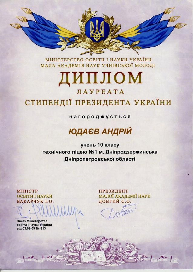 | ЮДАЄВ Андрій Вікторович  | Лауреат стипендії Президента України (див. диплом) |