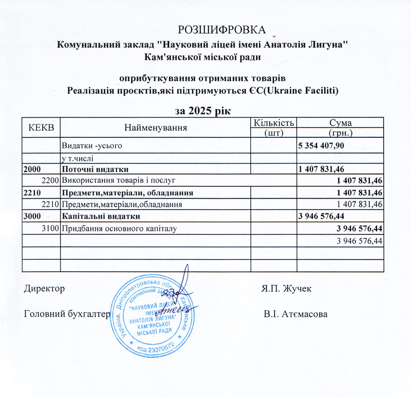 Бажаючі надати матеріальну допомогу КЗ “Науковий ліцей імені Анатолія Лигуна” можуть скористатися спец рахунком закладу:
