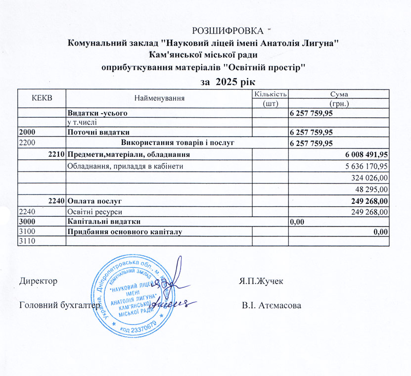 - Розшифровка оприбуткування матеріалів “Освітній простір”